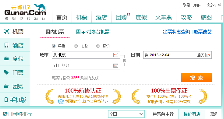 去哪儿网(Qunar.com)是全球最大的中文旅行平台,其网站上线于2005年5月,公司总部位于北京。去哪儿网通过网站及移动客户端的全平台覆盖,随时随地为旅行者提供国内外机票、酒店、度假、旅游团购、及旅行信息的深度搜索,帮助旅行者找到性价比最高的产品和最优质的信息,聪明地安排旅行。去哪儿网凭借其便捷、先进的智能搜索技术对互联网上的旅行信息进行整合,为用户提供实时、可靠、全面的旅游产品查询和信息比较服务。