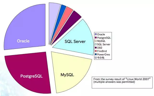 但是由于PostgreSQL抢占了先机,MySQL作为后来者想要进行追赶就要花相当长的时间了。到了2007年,在Linux World的调查中,用户对PostgreSQL了解的程度高于MySQL近50%,甚至与Oracle持平。