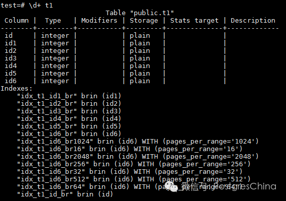 重点关注id6这个字段即可。可以看到在id6字段上,创建了总共8个BRIN类型的索引,稍后会讲解这8个索引各有什么不同。
