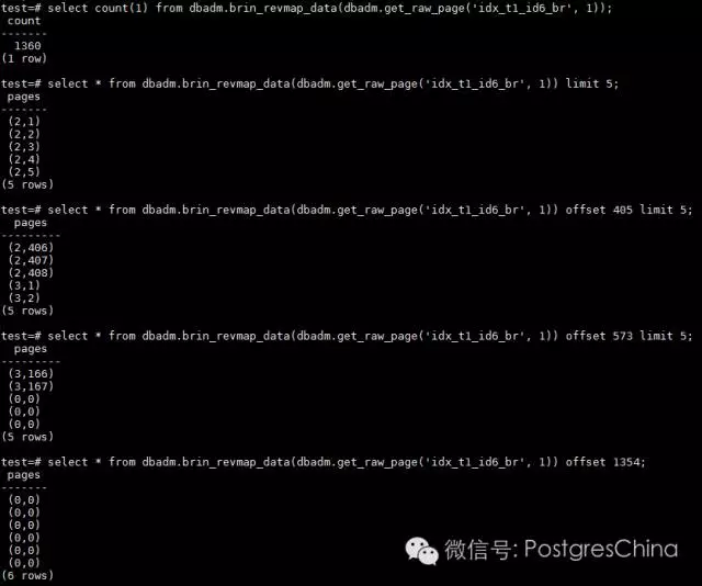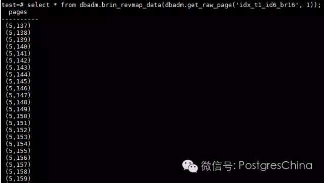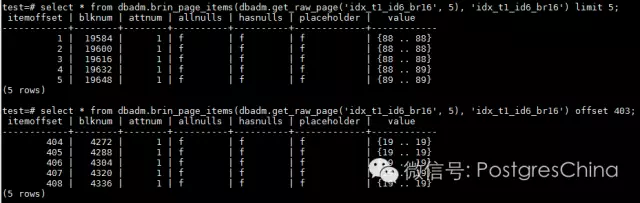 这个数据告诉我们,0-15heap page对应的BRIN索引条目是从索引的regularpage 5并且第137个条目开始的。根据revmappage的指示我们可以对BRIN索引regular page中的顺序获得完全的了解。