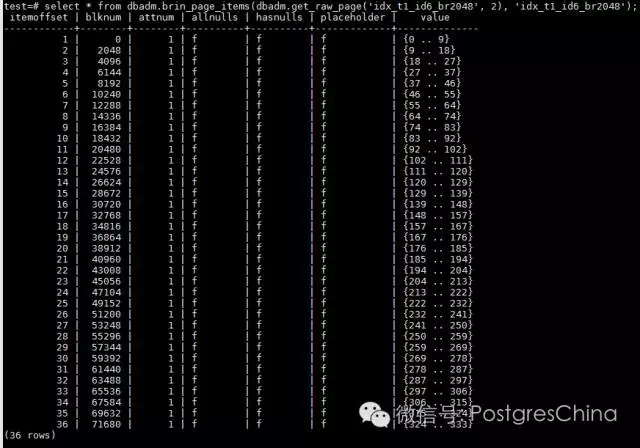 这个BRIN索引总共3个page,索引条目是36个,与前面分析的一致。