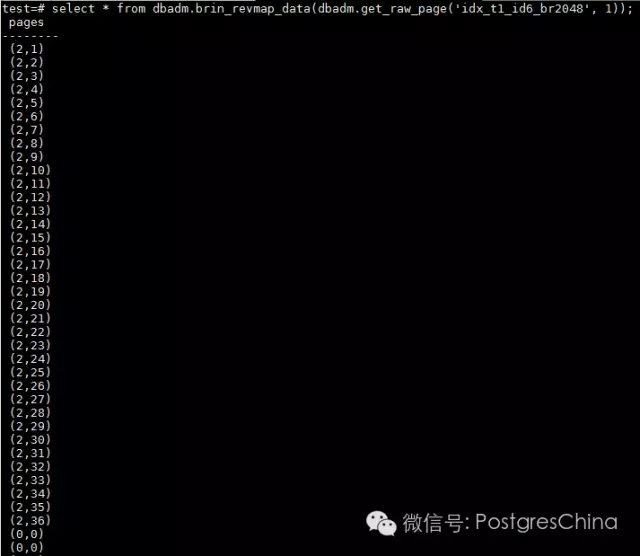2. 由于pages_per_range是2048,所以需要的BRIN索引条目是ceiling(73530/2048::decimal)=36,只需一个revmap page就可以涵盖;