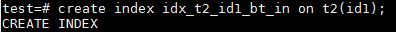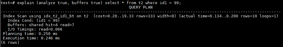 在id1=99时,由于是一个低频值,在Partial BTREE Index idx_t2_id1_bt中有对应的索引条目,PG优化器选择走索引,只需要访问11个buffer,执行时间也只有0.246ms。