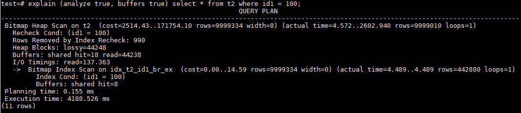 而在id1=100时,优化器选择走了Partial BRIN Index idx_t2_id1_br_ex,访问了表t2所有的heap page,Lossy=44248。加上扫描BRIN的buffer,总buffer数量是44256。这是正常的,前面提到id1=100的行占据了总数据量的99.9901%。