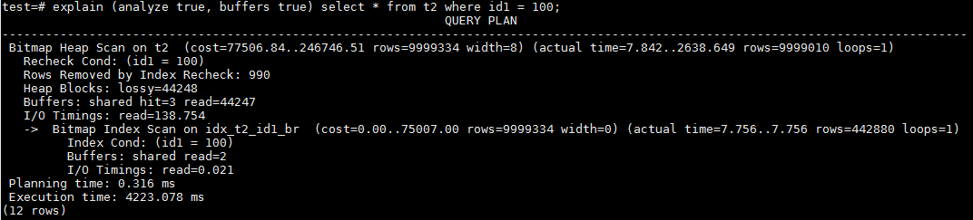 再看一下使用普通BRIN索引的情况,由于id1在0到99之间值很少,所以对最终结果影响不大。还是扫描了表t2所有的heap page,lossy=44248。扫描BRIN的buffer变成了2,最终总扫描buffer数量是44250。