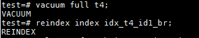 vacuum full操作相当于重建t4表,之前的dead tuple全部删除,并且占用的heap page也得以全部释放。重建后的idx_t4_id1_br索引也只包含了更新后数据对应的索引条目,看上去和案例一是相似的。