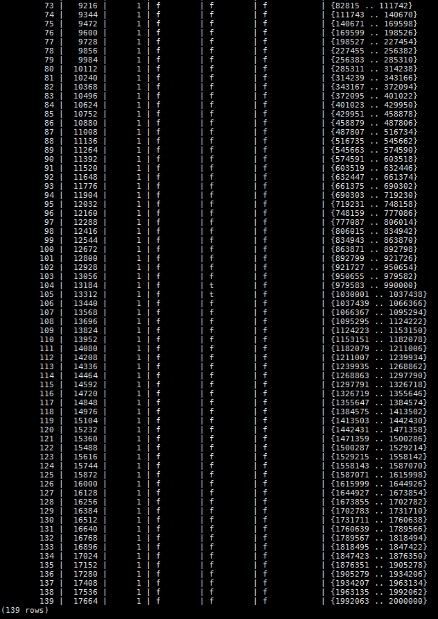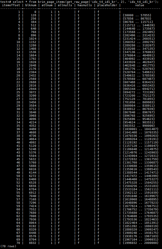 再来看一下BRIN索引regular page中的索引条目信息,请留意allnulls和hasnulls对应的值。在我们构造的案例中: