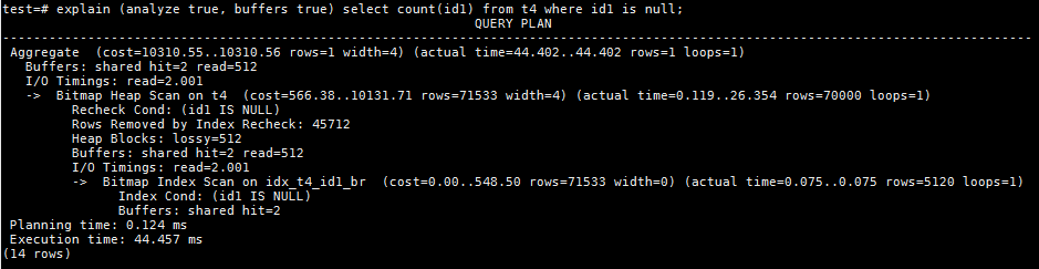 在这种情况下,当我们想要找出所有id1字段为非空的行的个数会发生什么?PG会扫描所有的heap page吗?来看下面的查询: