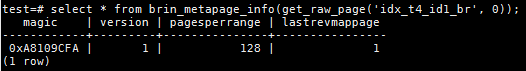 id1字段上的BRIN索引按缺省的pages_per_range=128创建,这点可以从下面的BRIN索引metapage中看到。