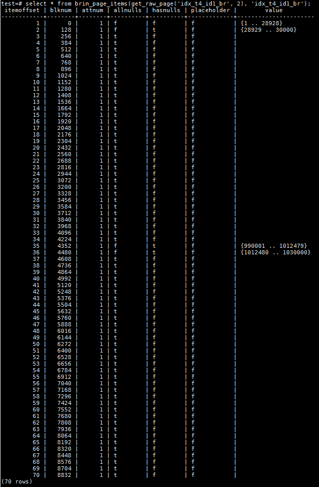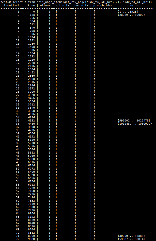 可以想象到,更新后,id1字段绝大部分都为非空值,而只有少数为空值。来看一下更新后的BRIN索引条目。