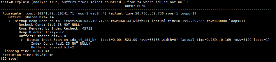 3. 如果想要访问id1字段为非空的数据,只需访问allnulls不是t的heap page范围。从前面分析的BRIN索引条目上得知,只有4个索引条目满足次条件,对应的heap page恰好是512个;