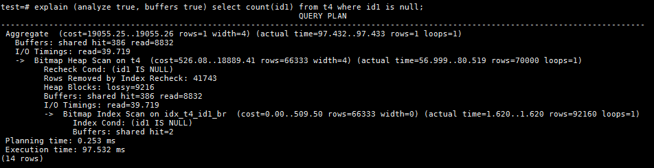 4. 本例中主要通过索引条目上allnulls的值,省却了大量不必要的heap page扫描,提升了查询性能;