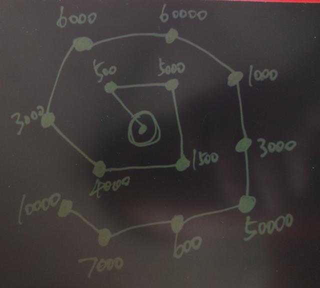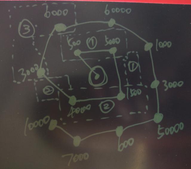 多点目标的最佳路径,用意是确保相邻目标的连续性,确保切分不同网点的快件后,拿到快件的人跑的是还是相邻的点。 例如中心是网点的位置,其他点是目标位置,目标位置的数字是体积,假设每个快递员一次运输的体积是7000,虚线是一个快递员拿到的一趟的快件。 这种方法确保了每趟的快件是连续的。