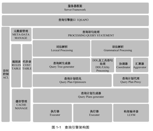 综上所述,一个查询引擎应该包括:查询语句接收模块、词法解析模块、语 法解析模块、查询树改写模块(规则优化模块)、查询优化模块(包括逻辑优化 和物理优化两部分)、查询计划生成模块、元数据管理模块、访问控制模块等基 本模块。当然不同的查询引擎在实现时,这些模块的划分可能不同,但是一个普 通的查询查询都应含有上述模块,图 1-‐1 为一个常规的查询引擎架构图。