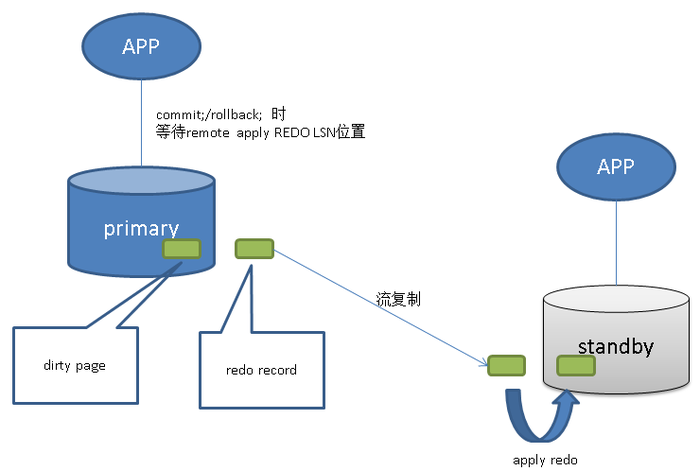 事务commit或rollback时,等待其redo在primary、以及同步standby(s)已持久化(>=其lsn)。 并且其redo在同步standby(s)已apply(>=其lsn)。
