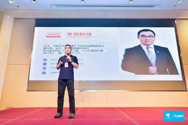 紧接着是本次大会的赞助商平安科技陈立明总经理代表企业发言,讲述平安科技选择Postgresql作为他们的金融数据库的原因,以及他们对于Postgresql的信心。
