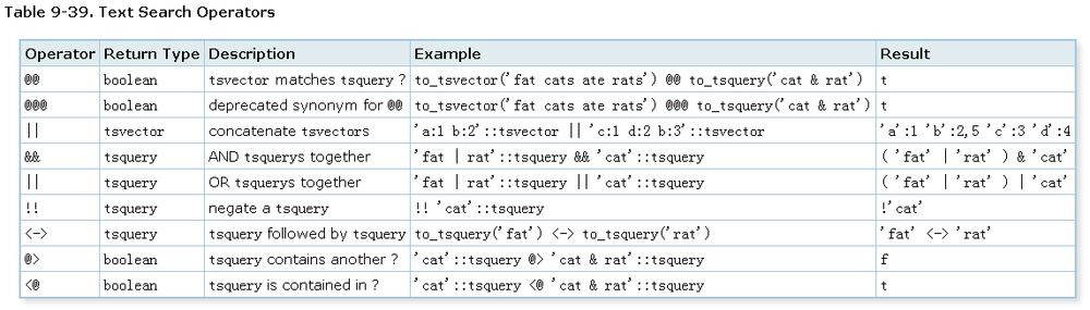 全文检索分为两个数据类型,一个是分词,一个是查询词组合。 https://www.postgresql.org/docs/9.6/static/datatype-textsearch.html