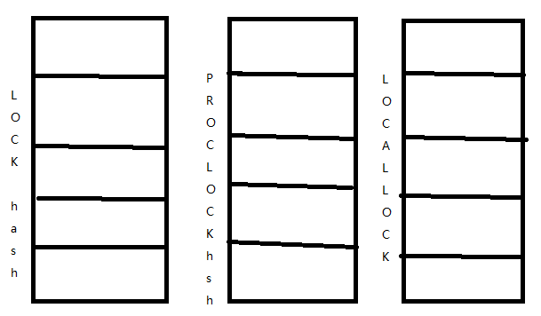 一个名为 “LOCK hash”的hash 表和一个名为“PROCLOCK hash”的hash表,同样一个名为“LOCALLOCK hash”的hash表也被创建。前两者是属于shared类型,而后者则是属于non-shared类型。每一个hash表项中或保存LOCK对象,或者是PROCLOCK或者LOCALLOCK。而这些所保存的对象描述于我们所申请的锁的相关信息,例如:该锁被持有的次数,该锁的访问模式等等。