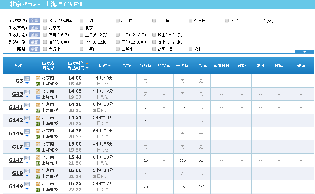 你如果要买从北京到上海的火车票,通常会查一下哪些车次还有余票。