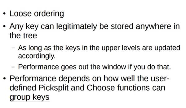 Performance depends on how well the userdefined Picksplit and Choose functions can group keys