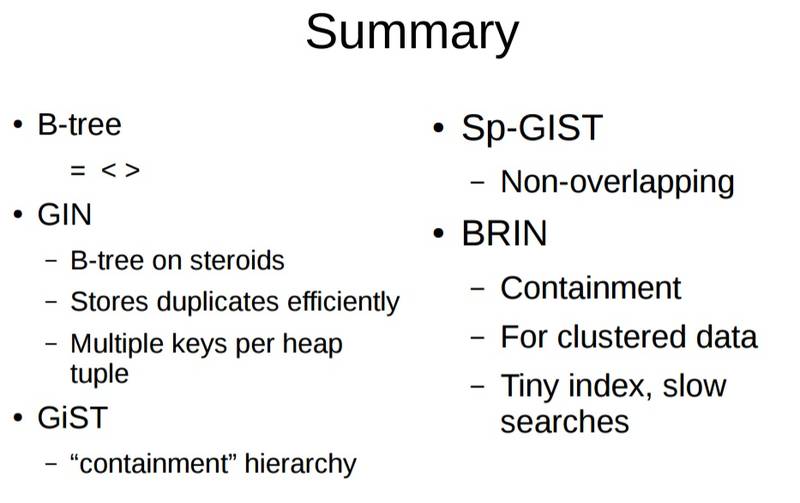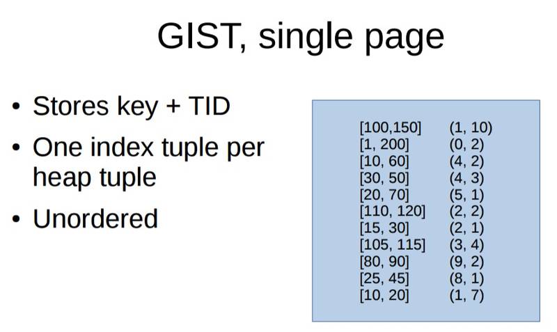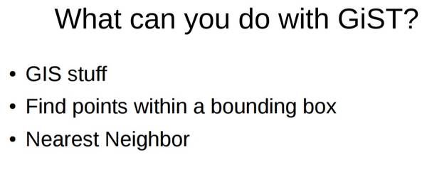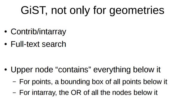PostgreSQL内置的range, geometry等类型的GIST已经帮你做好了,你只需要做新增的类型,比如你新增了一个存储人体结构的类型,存储图片的类型,或者存储X光片的类型,怎么快速检索它们,那就是你要实现的GIST索引聚集部分了。