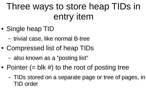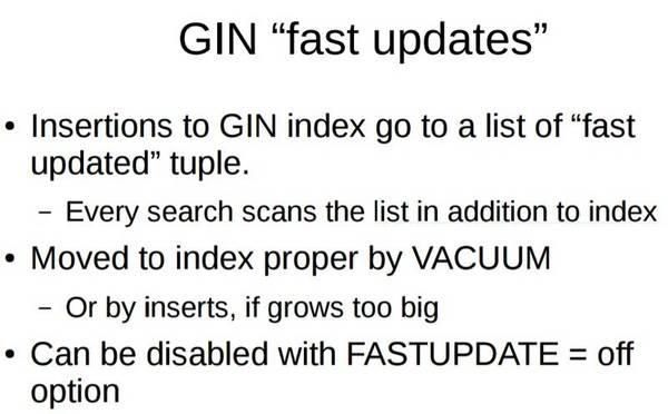 由于GIN存储的是元素索引,所以当一条记录被插入或更新时,可能涉及到很多个元素,对GIN索引来说,就会涉及到很多ITEM的变更。