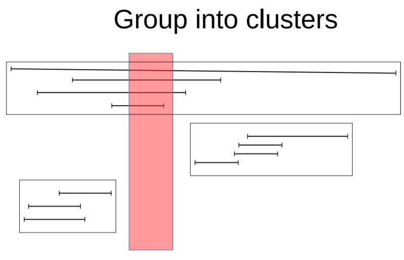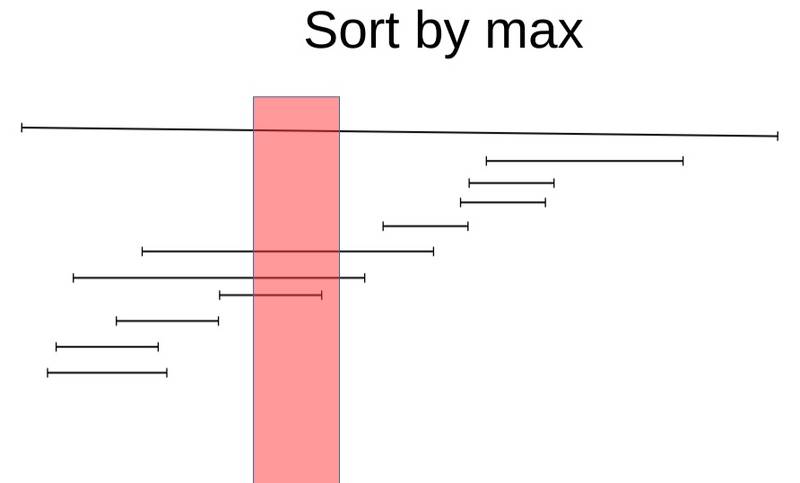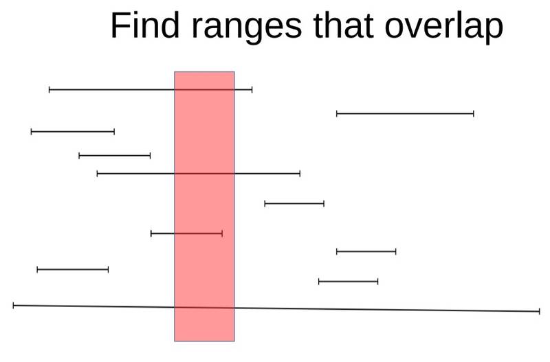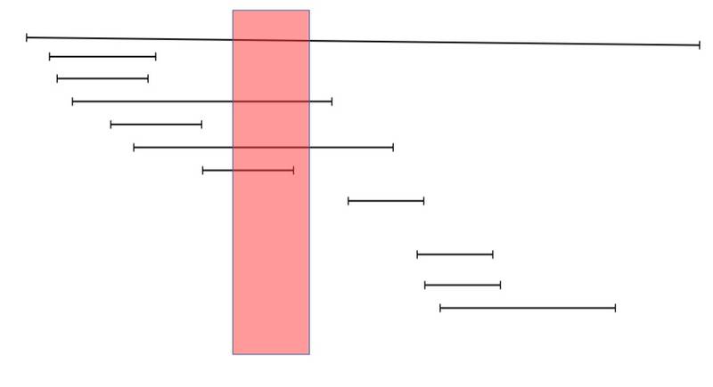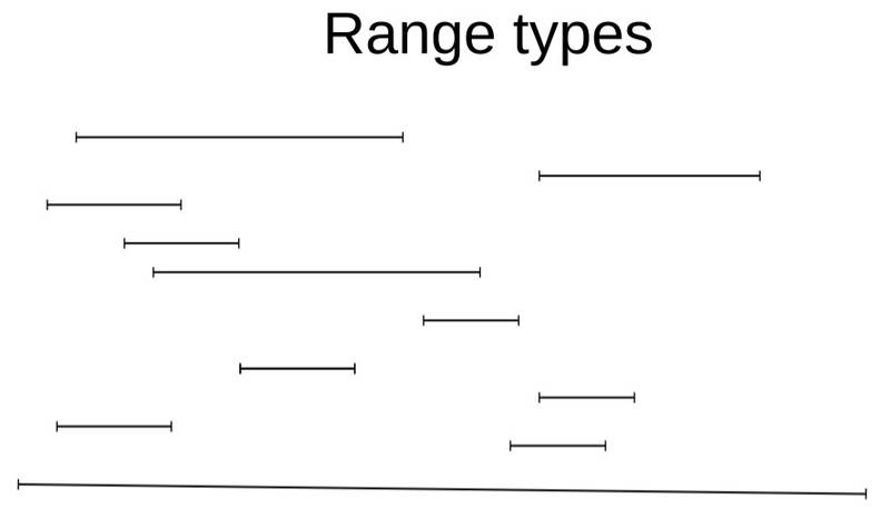 以范围类型为例,下图每一条线段表示某条记录,某个字段上面存储的范围类型所覆盖的范围。
