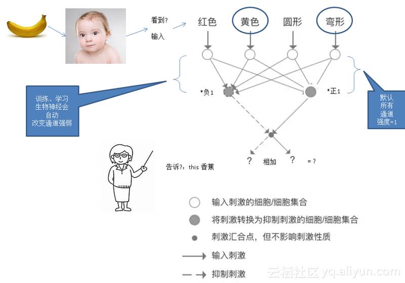五官是神经网络的输入之一,而另一方面,我们的长辈会教我们东西,比如你告诉小孩这是香蕉,小孩的神经会根据看到的形状、颜色等特征,以及你告诉他的(事实)做一个碰撞,调整连接这两个点之间的信号强弱,形成固定的模式,学习成功。