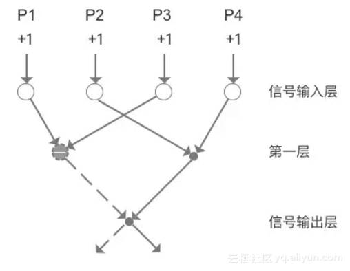 在识别苹果和香蕉的例子中,我们构建的其实是趋近于两层的单层神经网络,甚至形成了部分侧向抑制的能力,如果四个输入信号都被刺激,那么最终的刺激为0。