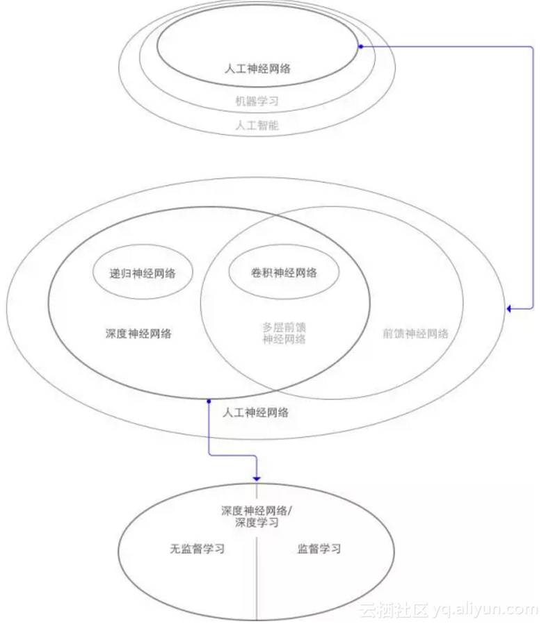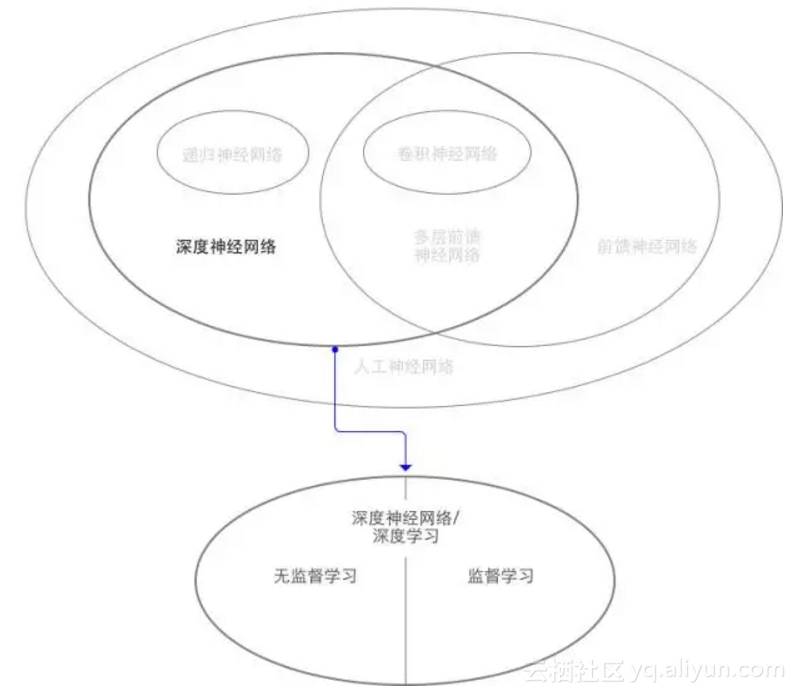 依赖深度神经网络的机器学习被称为深度学习。深度神经网络本身有几个重要的类型:递归神经网络,卷积神经网络,前馈神经网络,这几种神经网络有不同的应用场景。深度学习又可以分为无监督学习和监督学习,如下图。