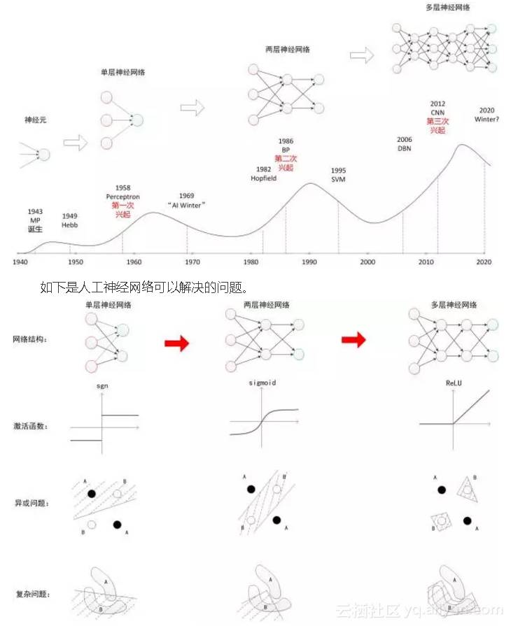 人工神经网络的发展并非一帆风顺,从最早的单层神经网络到现在的多层神经网络经历了七十多年的研究,如下是人工神经网络的发展简史。