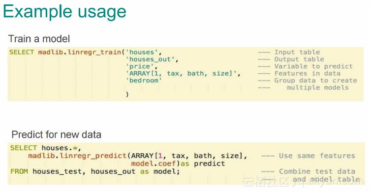 把机器学习库内置到database中(通过database的UDF)有许多优点,执行机器学习算法时只需要编写相应的SQL语句就可以了,同时database本身作为分析的数据源,使用非常方便,大大降低了机器学习的应用门槛。