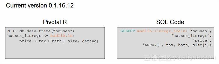如果你是R的数据科学家,并且不习惯使用SQL的话,使用pivotalR的R包就可以了,左边是R的写法。右边对应的是SQL。
