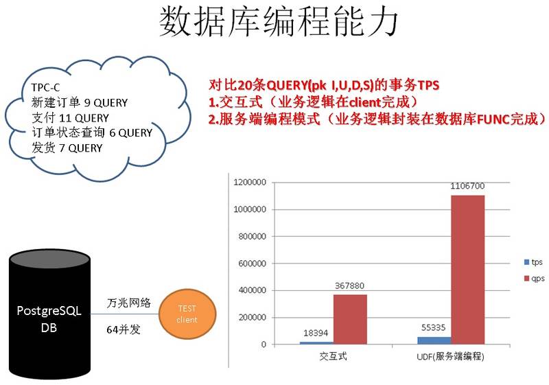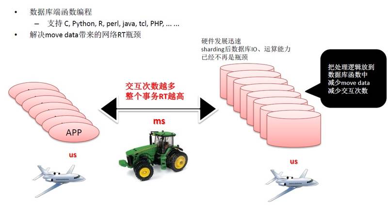 看完以上几组测试数据,知道为什么要写"数据库小程序"了吧。尽量的让数据和运算靠近,避免多次交互造成的网络RT放大问题。(当然了,并不是推荐大伙一切都丢给数据库,还是要有个度的,从图1我们可以了解到,随着硬件的发展和SHARDING技术的普及,尺度越来越大可能是个趋势呢,嘿嘿。)