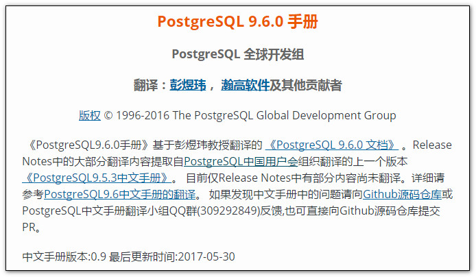 在武汉大学彭煜玮老师及其团队,瀚高软件公司司韩悦悦等一大批工程师的努力下,PostgreSQL最新版本9.6系列的中文手册正式上线。这对PostgreSQL的广大中文国内用户以及海外用户都是福音,这必将对PostgreSQL在国内的推广应用至重要的推动作用。手册的各位翻译者同时也是PostgreSQL中文社区的志愿者,在此,我们向他们所付出的辛勤汗水表示我们的敬意。