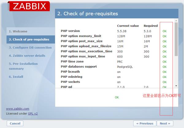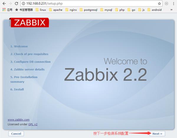 打开浏览器输入 192.168.0.231 (zabbix-server部署机器ip地址),出现上面的安装向导首页,然后按next按钮,接下系统系统会检查所有需求参数