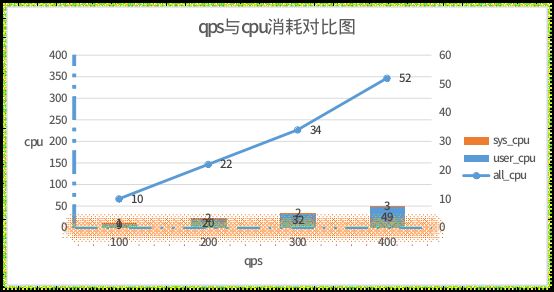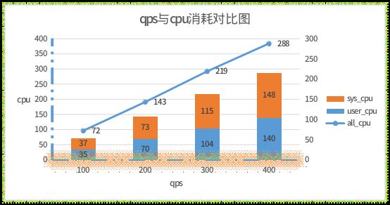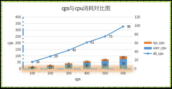 次数/秒 系统cpu使用量 系统cpu占比 用户cpu使用量 用户cpu占比 总使用量 总占比 100 4 1.00% 12 3.00% 16 4.00% 200 6 1.50% 23 5.75% 29 7.25% 300 9 2.25% 34 8.50% 43 10.75% 400 13 3.25% 48 12.00% 61 15.25% 500 15 3.75% 60 15.00% 75 18.75% 600 20 5.00% 78 19.50% 98 24.50%