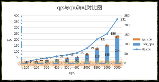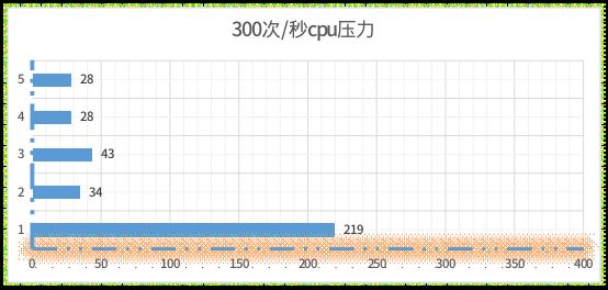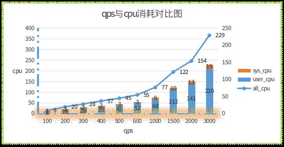 次数/秒 系统cpu使用量 系统cpu占比 用户cpu使用量 用户cpu占比 总使用量 总占比 100 1 0.25% 8 2.00% 9 2.25% 200 2 0.50% 18 4.50% 20 5.00% 300 2 0.50% 26 6.50% 28 7.00% 400 2 0.50% 35 8.75% 37 9.25% 500 3 0.75% 42 10.50% 45 11.25% 600 3 0.75% 52 13.00% 55 13.75% 1000 9 2.25% 68 17.00% 77 19.25% 1500 10 2.50% 112 28.00% 122 30.50% 2000 13 3.25% 141 35.25% 154 38.50% 3000 19 4.75% 210 52.50% 229 57.25%